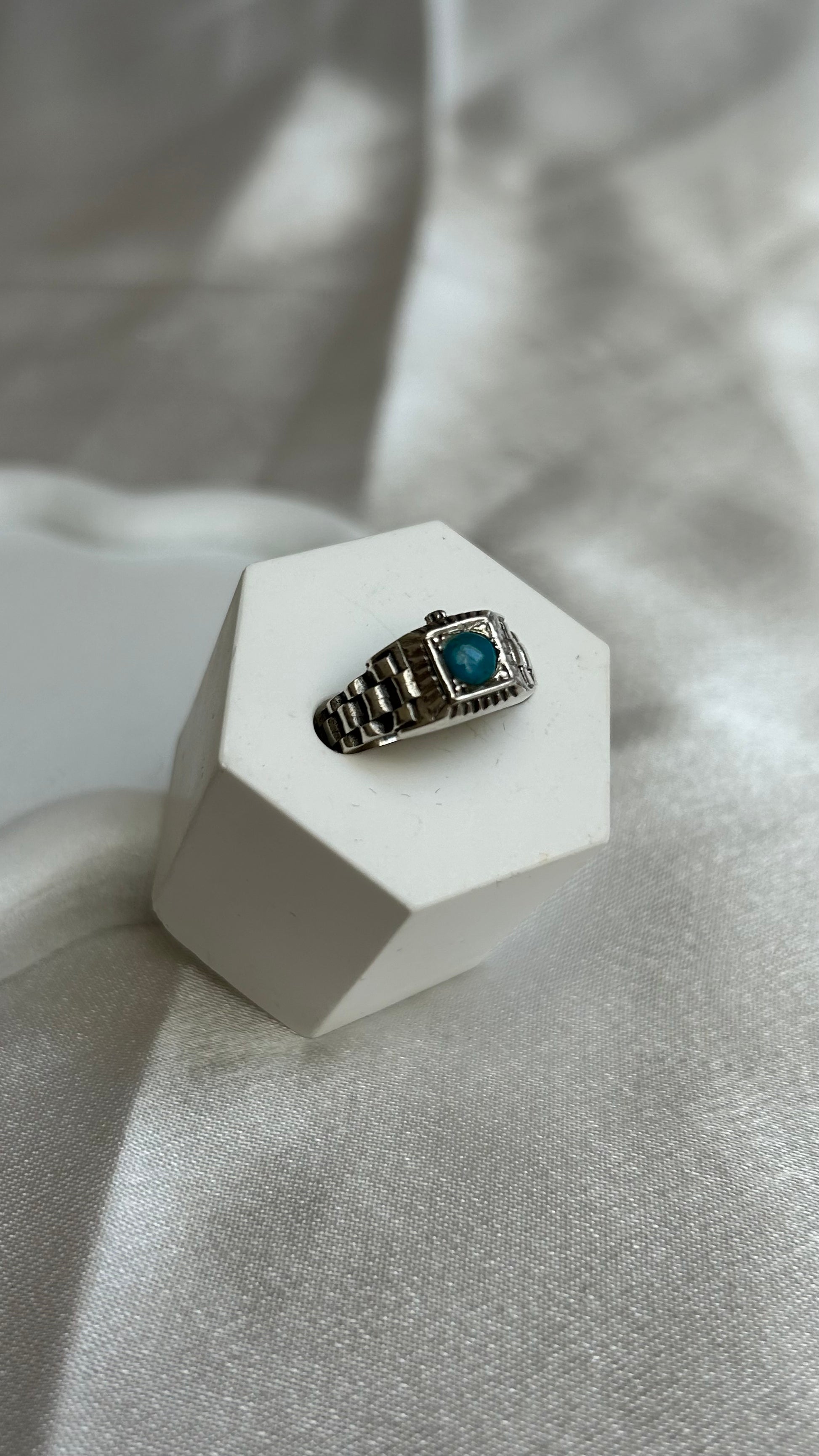Découvrez cette élégante bague chevalière en argent et turquoise taille 50 d'occasion, un bijou unique qui allie charme et histoire.