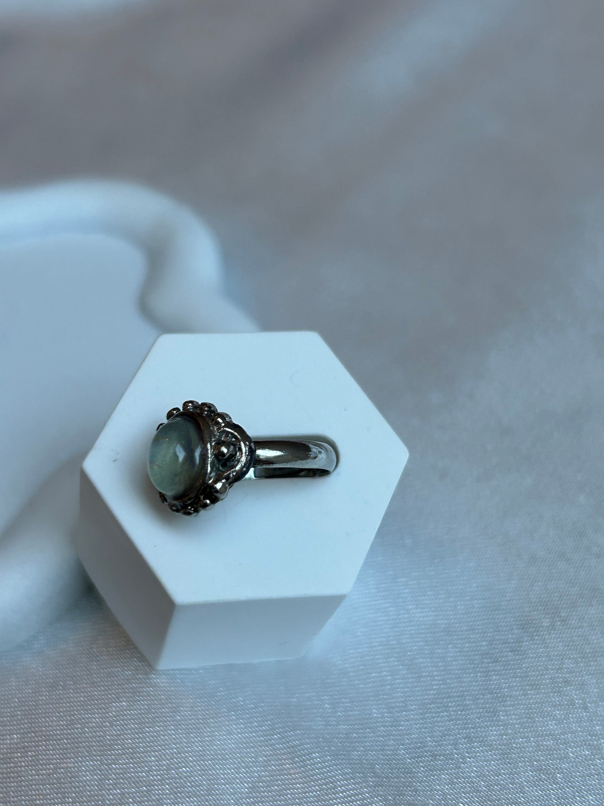 Découvrez cette élégante bague argenté et pierre strass turquoise jaune taille ajustable d'occasion, un bijou unique qui allie charme et histoire.