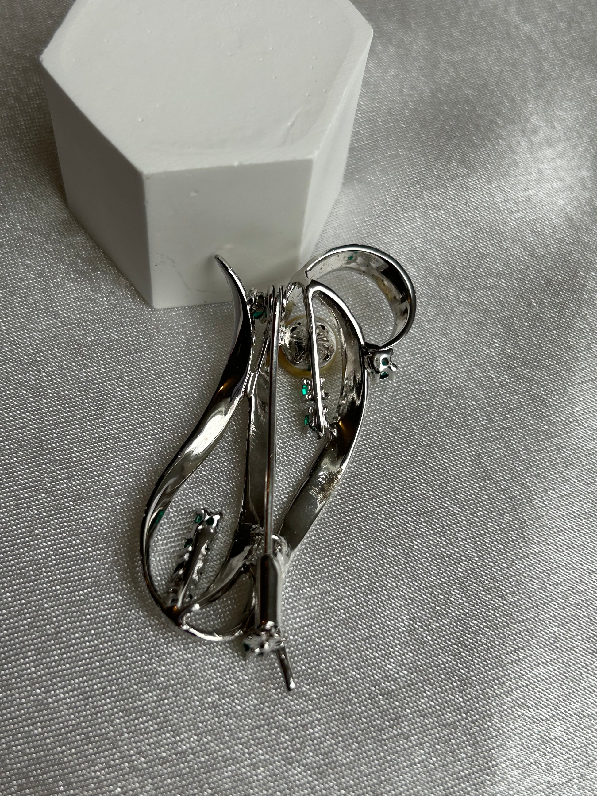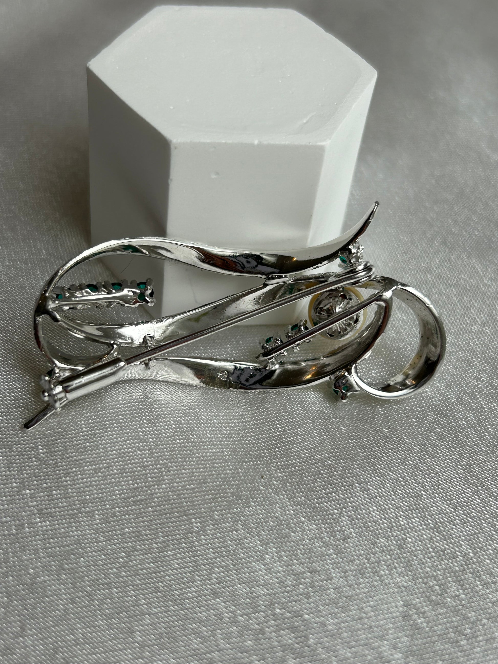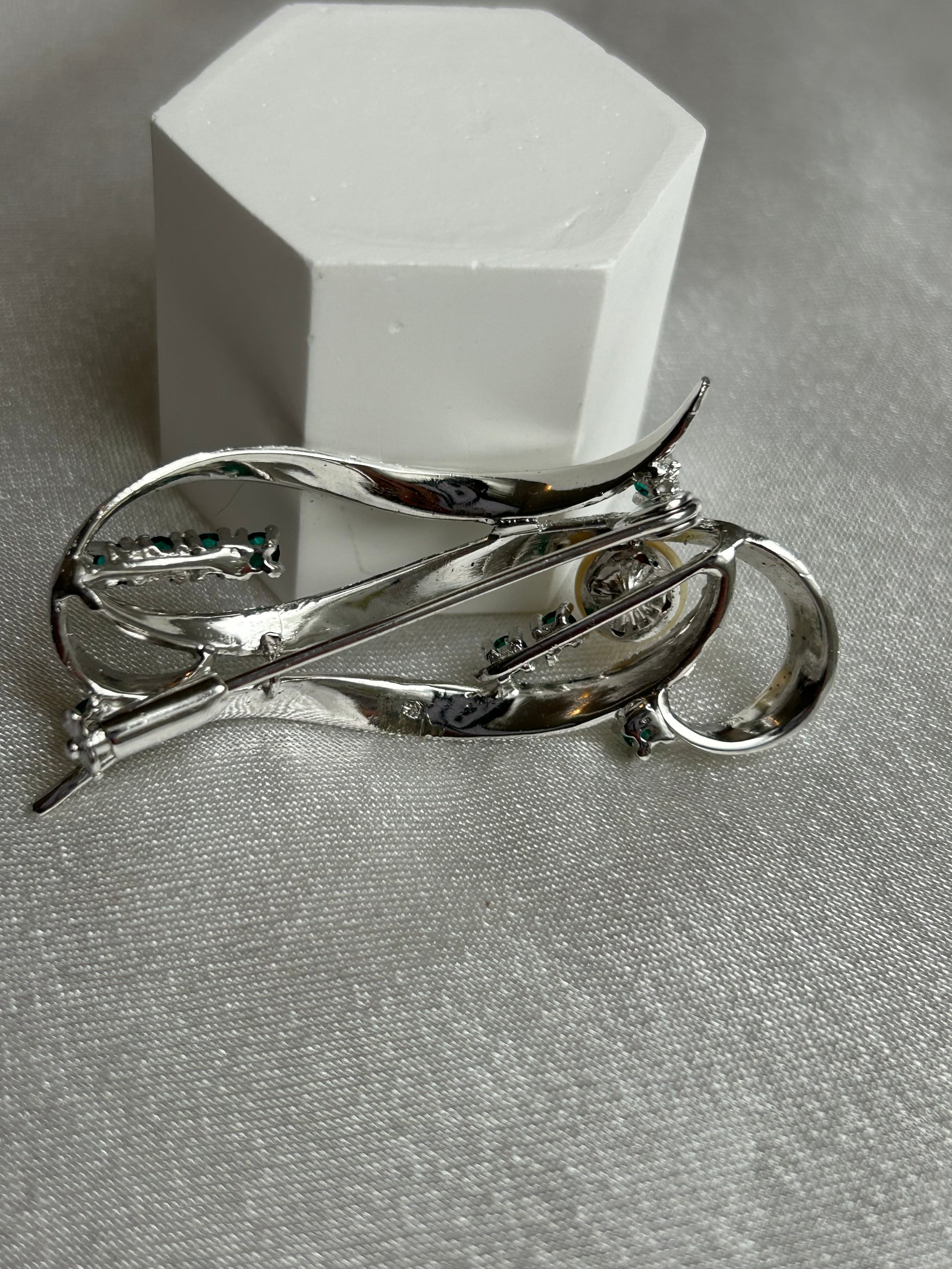 Découvrez cette magnifique broche vintage argente à strass vert et perle un bijou unique qui allie charme et histoire